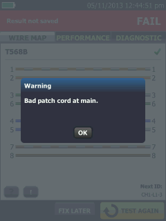 Bad patch cord at main / remote reported on DSX CableAnalyzer