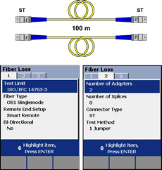 In this example, we're going to test a 100 m duplex 9/125 µm singlemode fibre link with ST connectors at each end to ISO/IEC 14763-3.