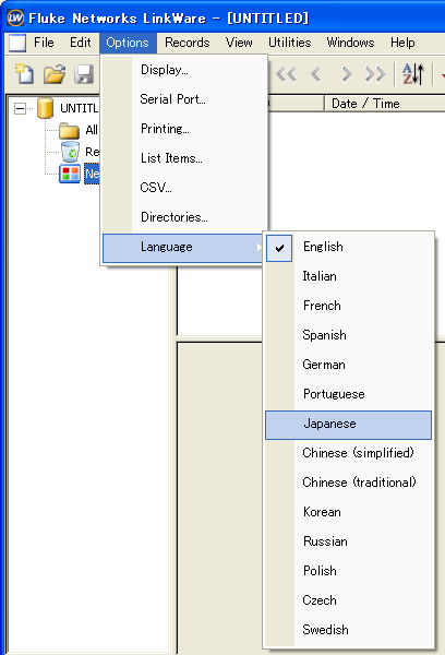 LinkWare を起動した後、”Option” -> “Language” -> “Japanese” を選択することで、日本語表示に切り替わります。レポートも日本語表示になります。